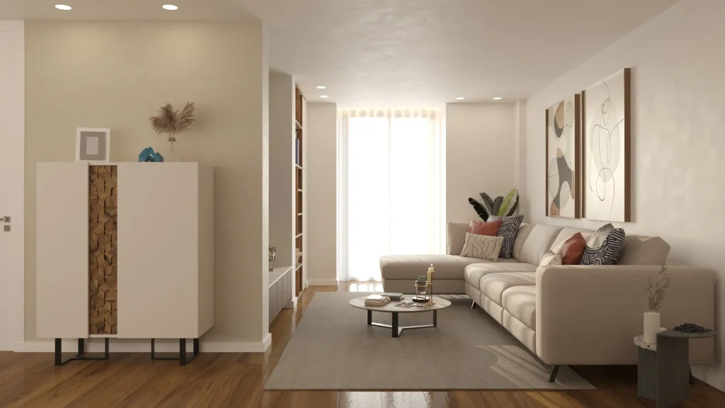 This interior design project adopts a human-centric approach, prioritising physical and emotional wellbeing through integrated and welcoming spaces. The contemporary aesthetic is defined by biophilic principles, utilising natural materials such as timber and marble to promote harmony and health. In the social area, the open-plan layout maximises natural light and the flow between the lounge and dining zones. The bedroom reinforces comfort with slatted joinery and integrated indirect lighting. Blending functionality with sophistication, the environment employs modern technology and bespoke finishes to create a balanced, secure, and elevated living experience.