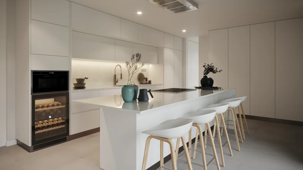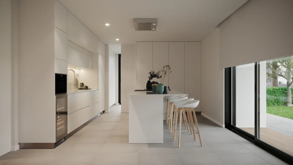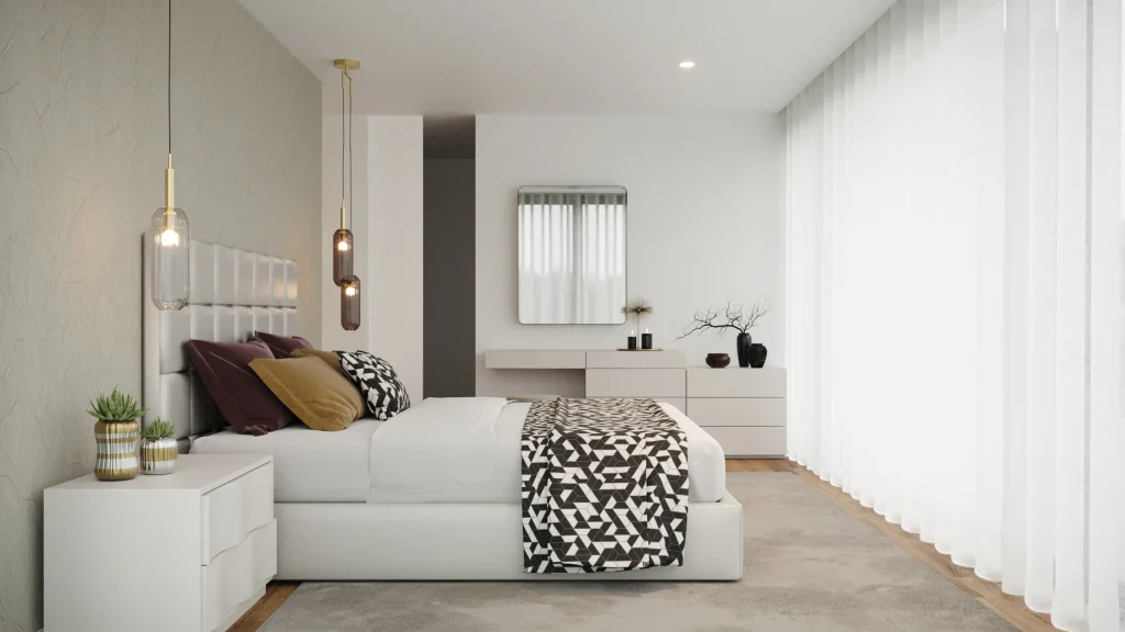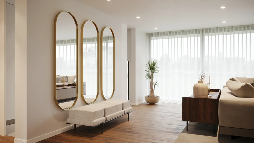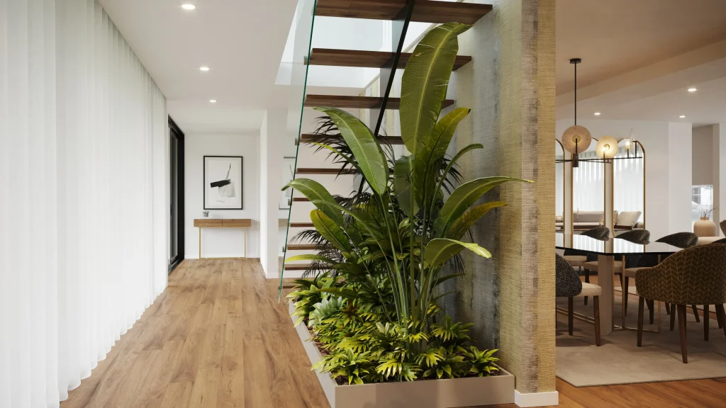 Biofilia e Luz: Janelas amplas maximizam a entrada de luz natural, reforçando a conexão com o ambiente externo e promovendo a saúde.