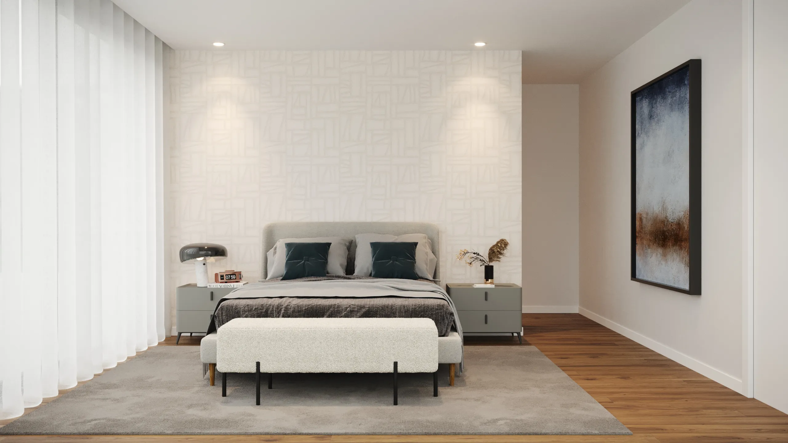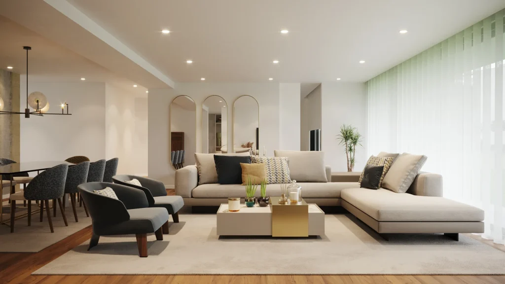Cromoterapia Sutil: A paleta de cores neutras é pontuada por tons de azul, verde esmeralda e terracota, estrategicamente aplicados em estofados e quadros para estimular relaxamento ou criatividade.